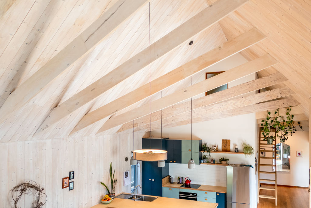Having lived in the finished house since mid-2018, some of their favourite parts include a helix design incorporating the roof collar ties, and the high ceilings that make the place feel much larger than its modest footprint.