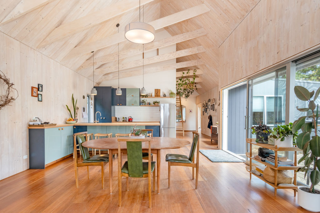 Their quest to keep things simple extends to the kitchen, which features a plywood bench edged with blackbutt. Muted tones aim to echo the surrounding bush and create a calm atmosphere.