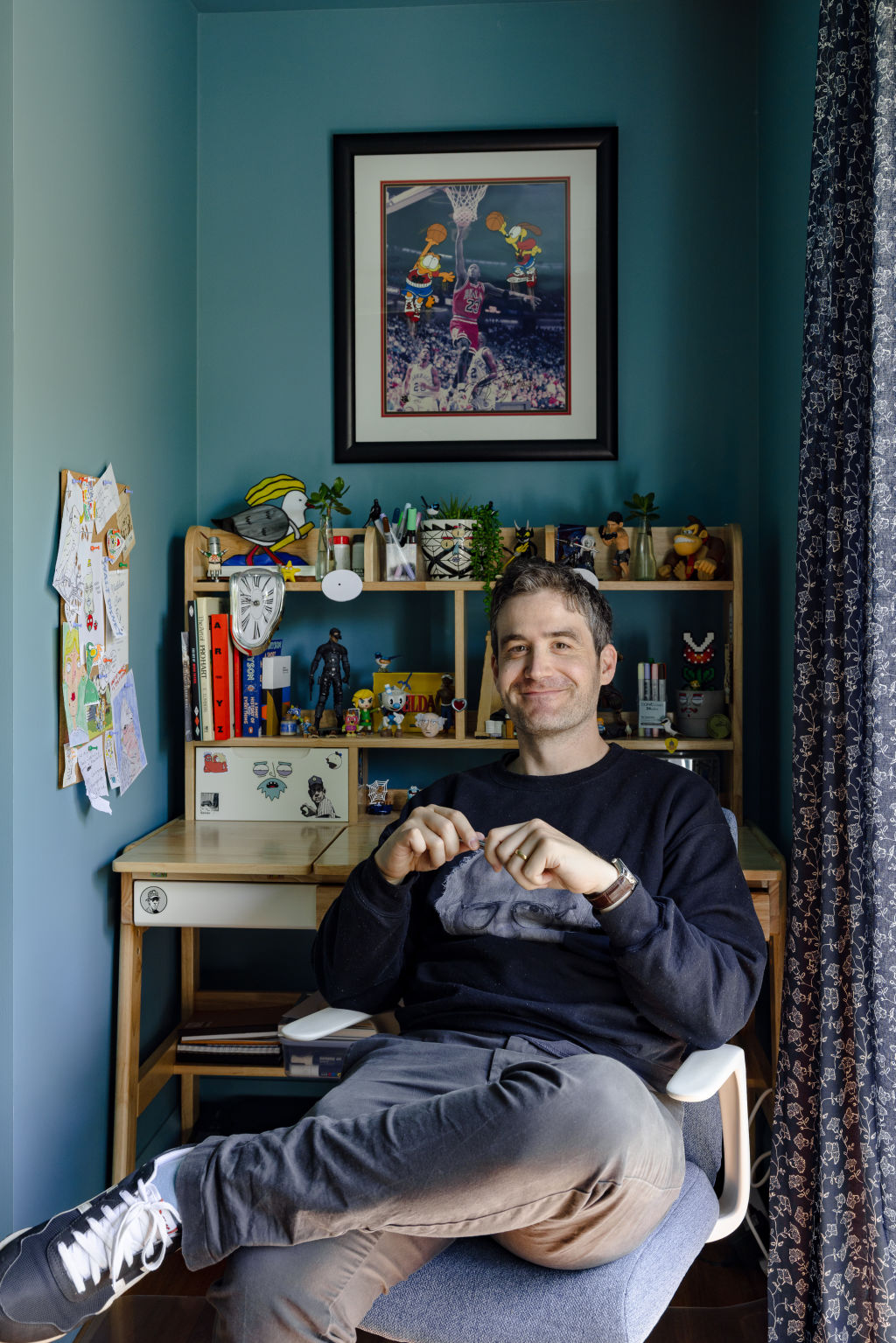 Collectors’ items clutter his desk, mostly figurines and memorabilia from childhood favourites – Lego, The Simpsons, Jaws, Seinfeld and Larry David, the latter two informing his love of comedy and acting.