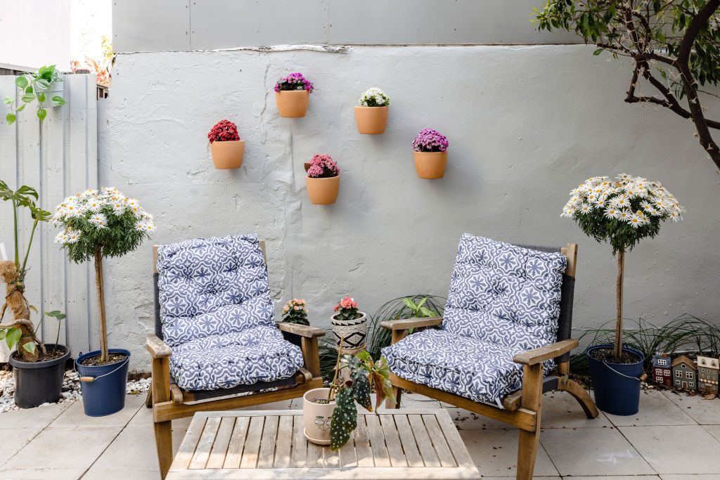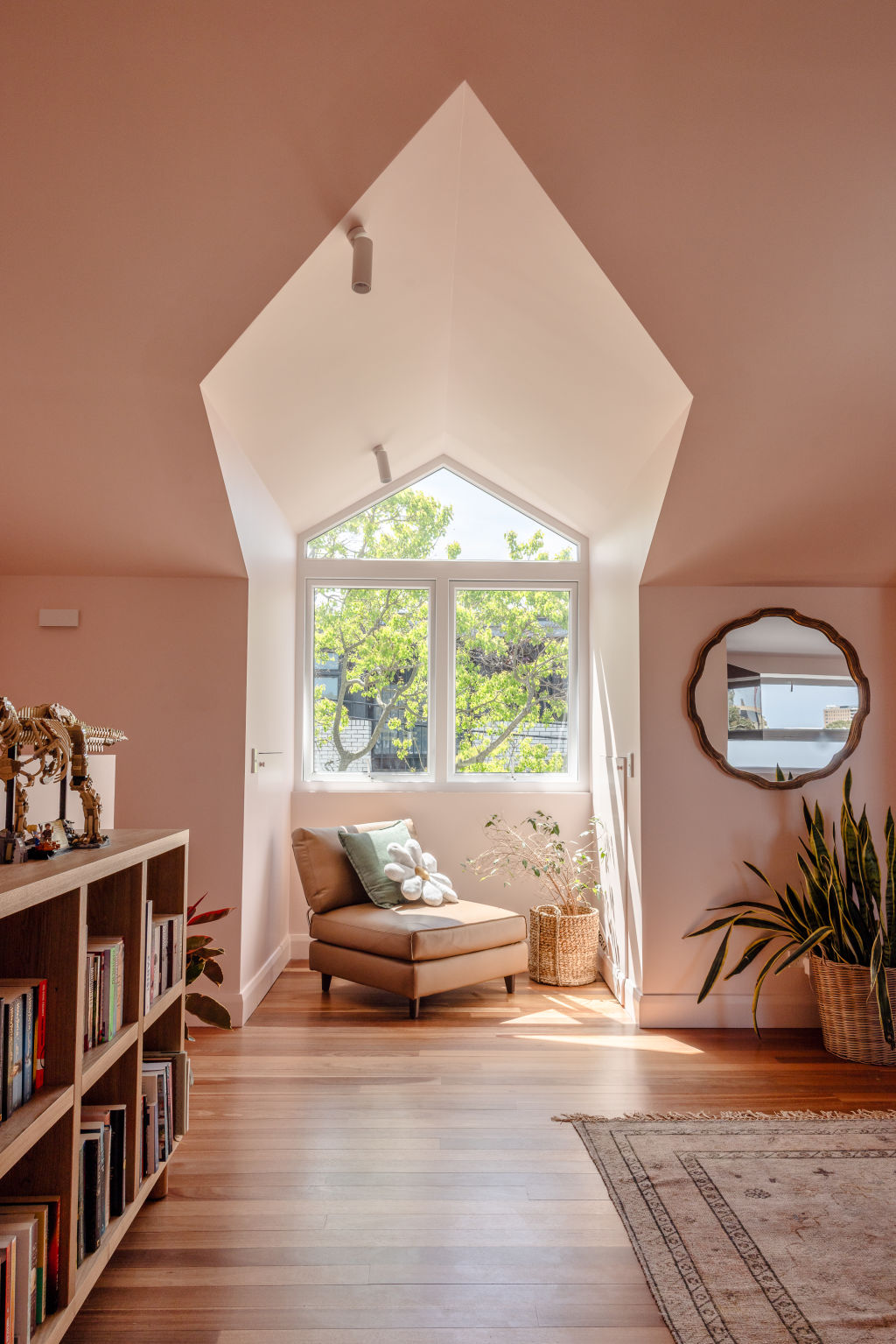 The front door is red on one side and blue on the other. Daisy’s room has a bright yellow door, and a deep purple one leads up to “the retreat” – the lovely large main-bedroom suite at the top of the house, which is painted in calming pink, and where far-reaching views over Sydney rooftops can be enjoyed.