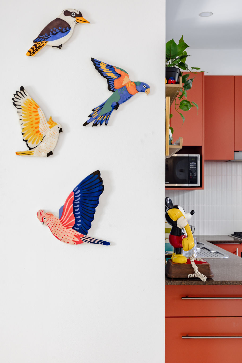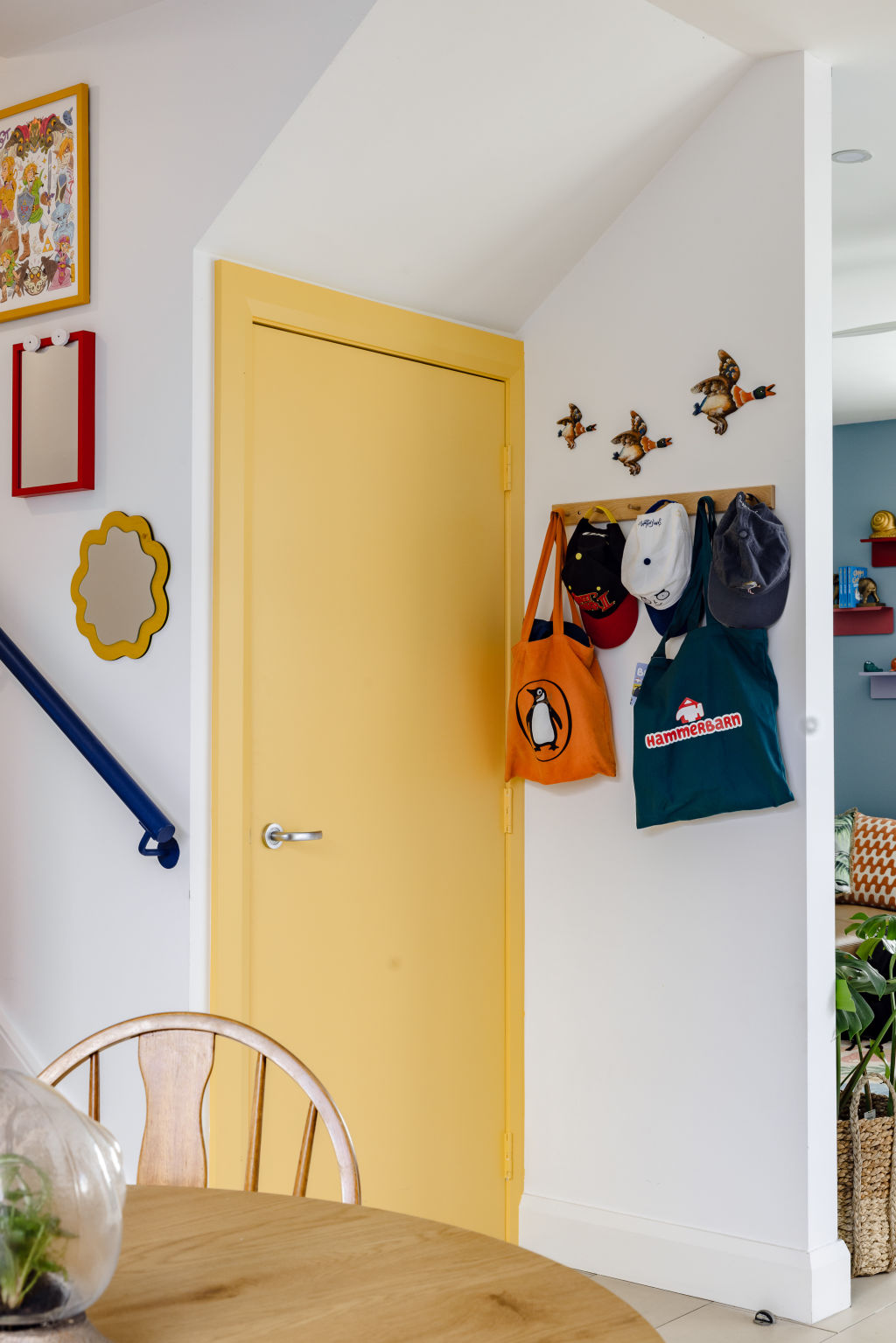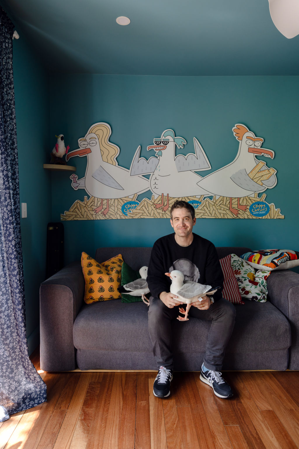 Colourful birdlife adorns the walls and rugs; cushions take gull, crab and jellyfish form; Cotton’s animated creations peer out at visitors; and “chippie chaser” cartoon seagulls are displayed on the wall above the sofa.