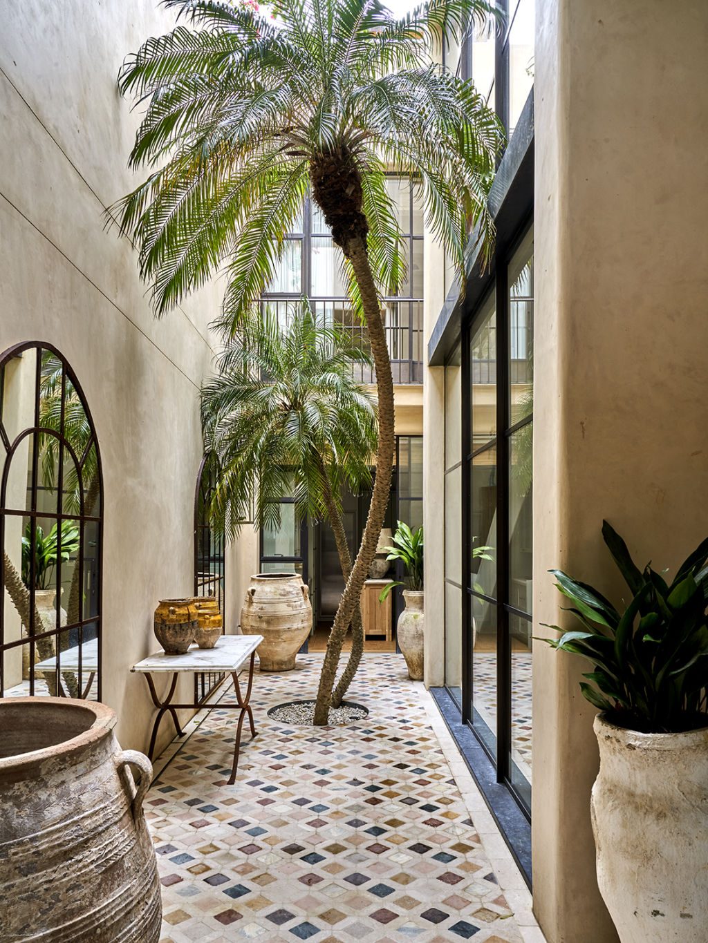 Indoors, the two dwarf date palms, rising more than three-and-a-half and four-and-a-half metres respectively, were the most eye-catching features, situated in the three-level internal courtyard conceived by interior designers Studio Snoop.