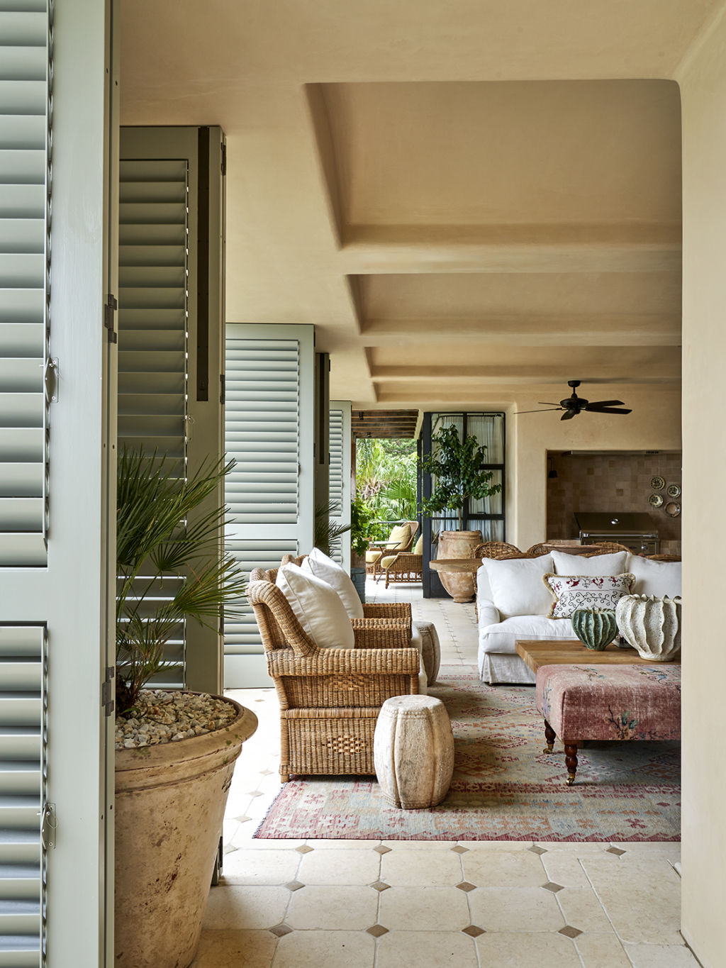 On the main living floor terrace, for instance, were several olive trees in custom-made pots. Plants decorated the lanai, an indoor-outdoor room overlooking the pool, including European fan palms and bougainvillea.