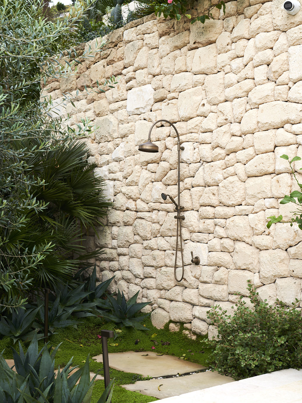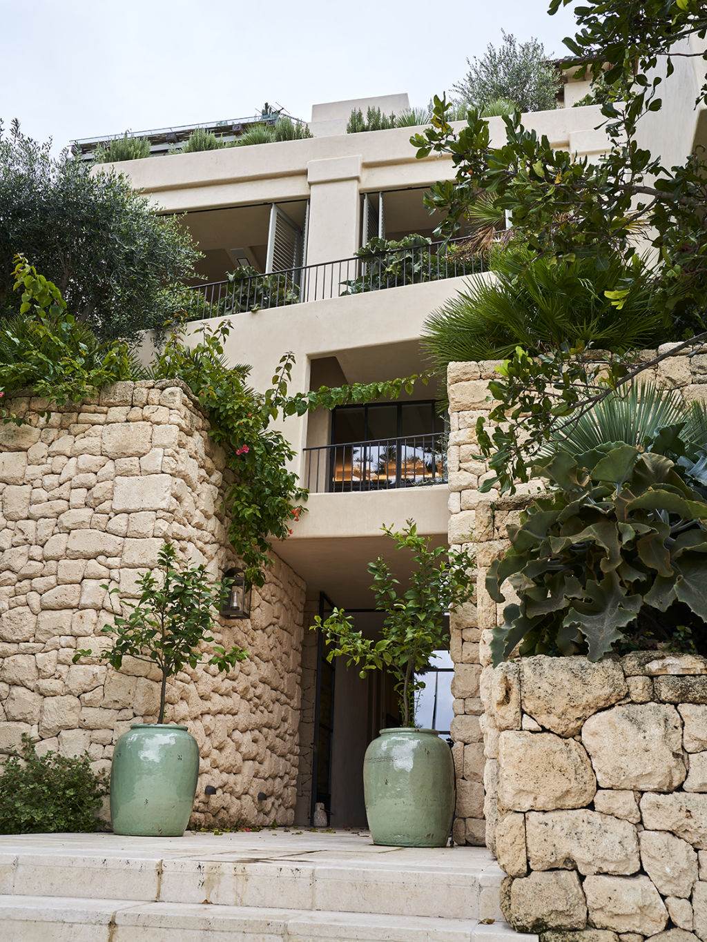 He also included a mix of plants growing up and cascading down the facade, such as bougainvillea and Japanese jasmine, to create a tapestry feel.