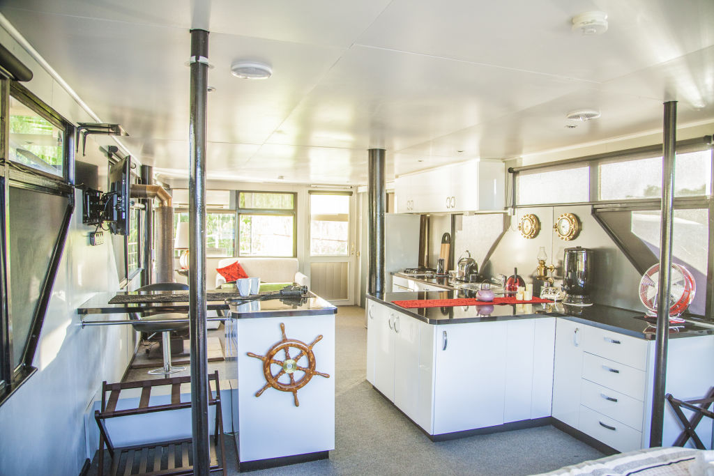 It’s a different way of life for the 1976 boat that originally carried passengers on leisure cruises on the Murray. “It [used to be] like a bus, basically,” Jim says. “Rows of seats down either side and a deck on the top.”