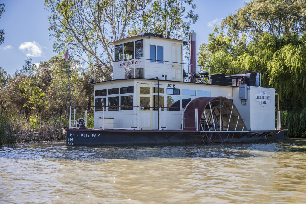 On a quiet stretch of the Murray River near Renmark, the PS Julie Fay sits moored within view of its owners’ riverside home.