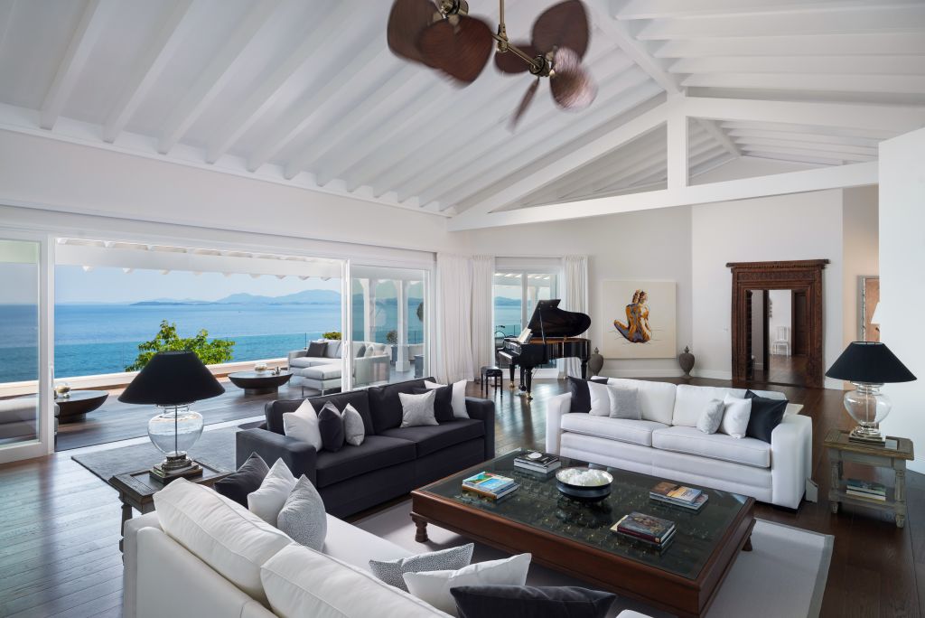Entry is via the upper level, where a grand piano sets the tone for the sprawling open-plan living and dining area, all bathed in sea views.
