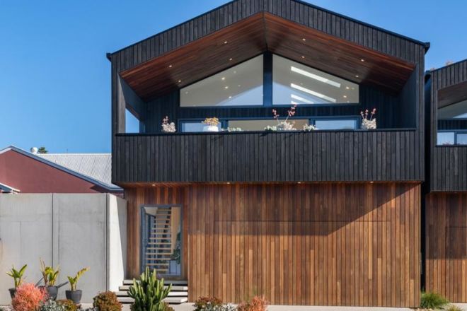 The chic interiors include a stunning timber staircase that leads to an open-plan kitchen-dining-living zone on the upper floor.