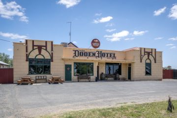 The two-bedroom homestead features raked ceilings, a cosy wood fire, slow-combustion heating, and a verandah overlooking the paddocks.