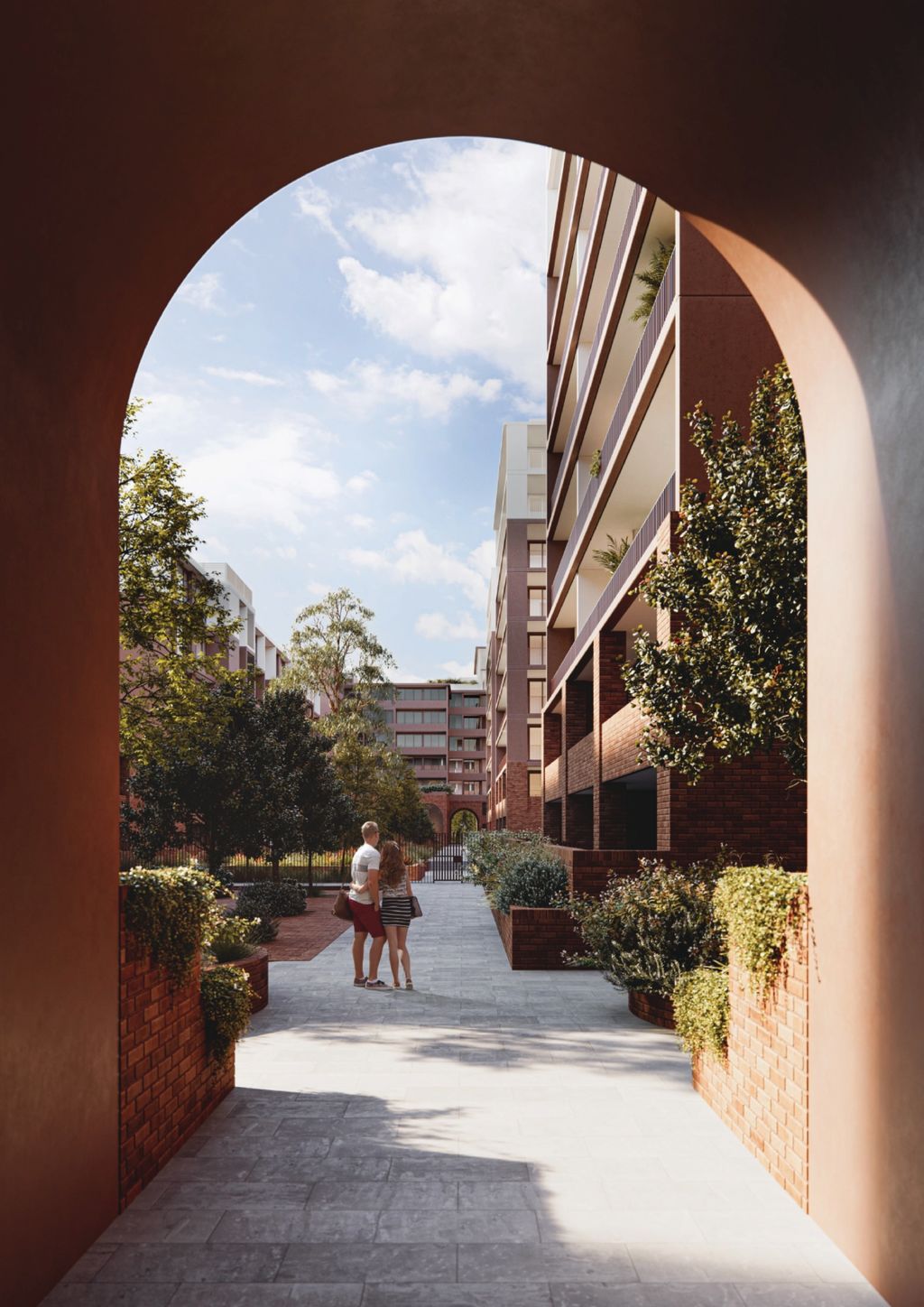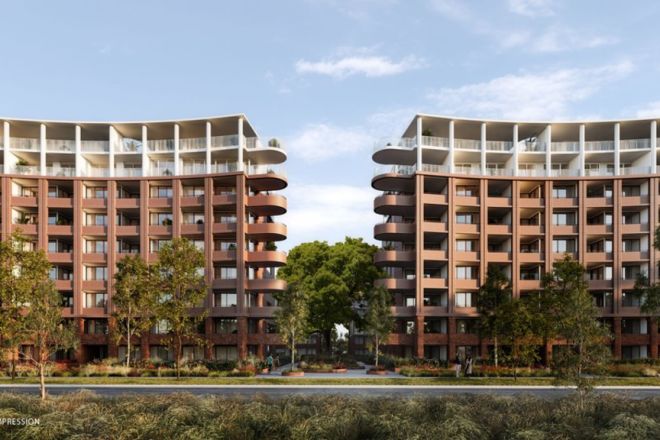 Stage one of the nine-storey buildings will include 249 one, two and three-bedroom apartments. The three-tone facade, which changes from red brick at ground level to terracotta and white, is inspired by the Canberra landscape.