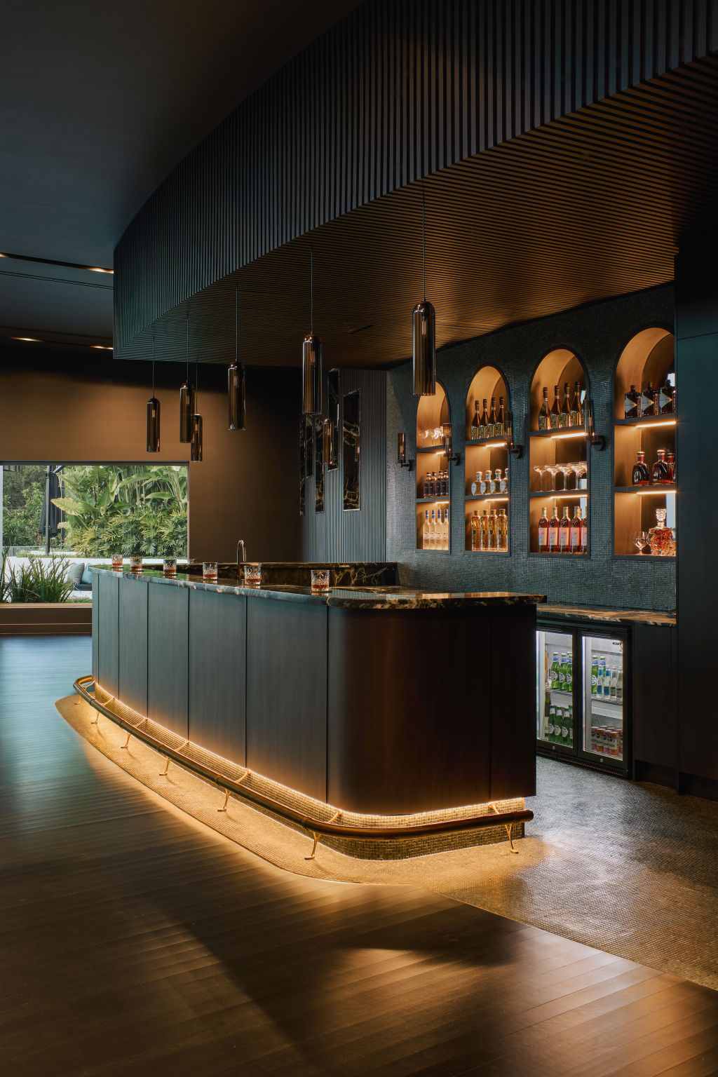 The kitchen, anchored by calacatta viola marble and a sculptural copper rangehood, pairs chef-grade appliances with floor-to-ceiling glass. A wine and tasting room, with dry-ageing fridges for meats and cheeses, leads to a hidden cellar. Of the property’s 3000-bottle wine spaces, 1200 are climate-controlled.
