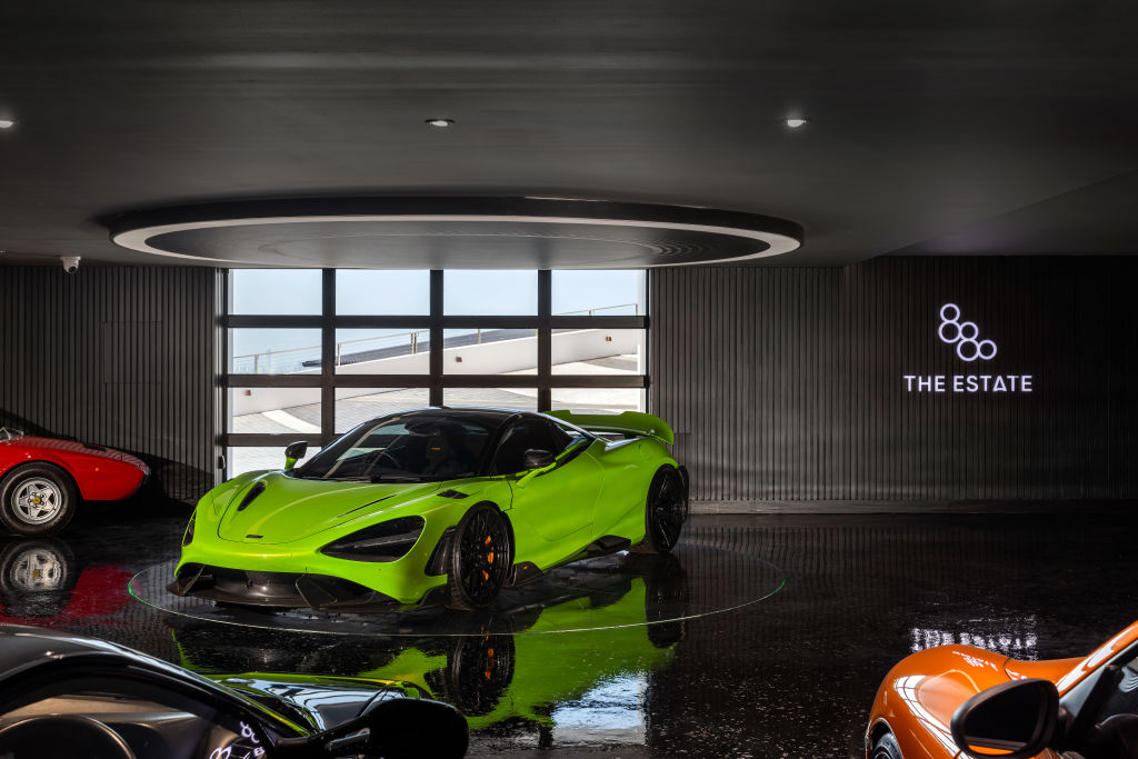 Garaging is treated like gallery space, with screens to display each car’s logo and a central turntable. A hydraulic race simulator occupies its own bay.