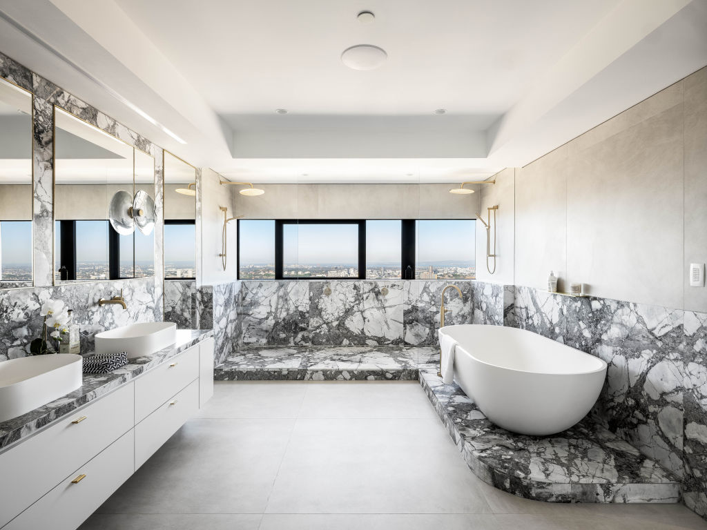 Stepping into the main bathroom, lined with matching Cote d’Azur marble, there is a choice of soaking in the free-standing bath or jumping under one of two rain showers, which have a view over Centennial Park and the suburbs beyond.