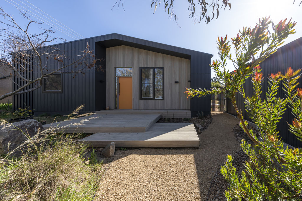 The knock-down rebuild, which achieved an 8.2-star energy rating, features a dynamic interplay of materials, starting with an eye-catching facade of sustainable Weathertex panels and warm blackbutt timber before adding contrasting dark-grey Colorbond and a playful yellow front door.