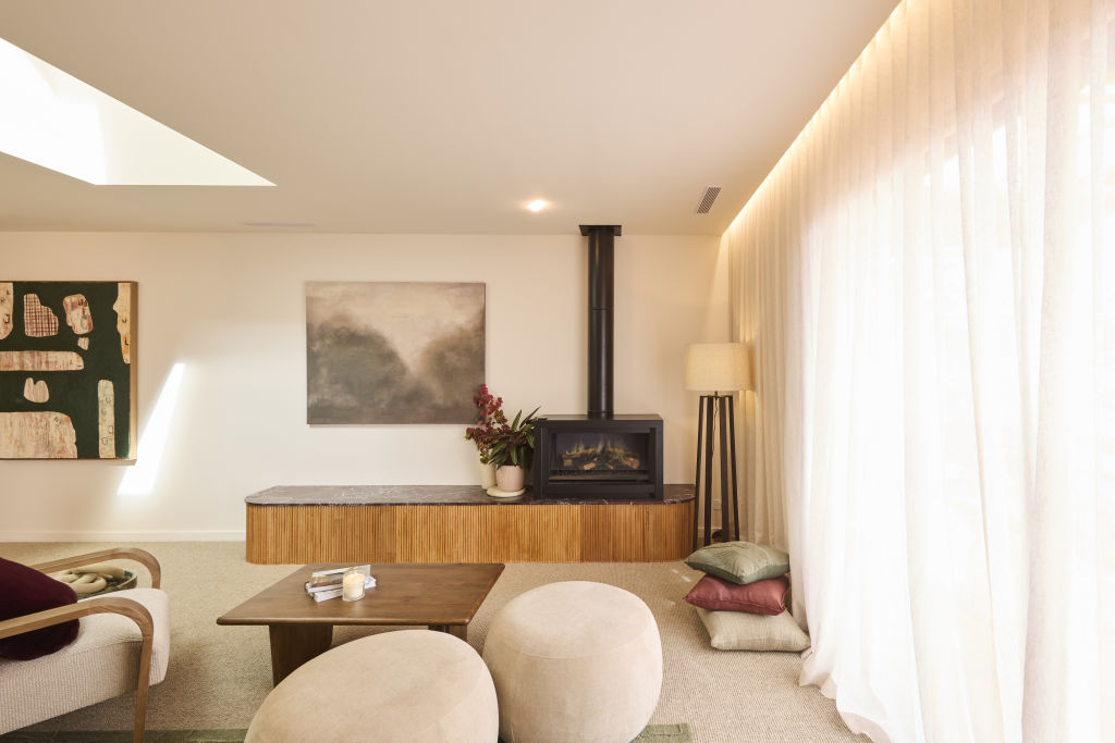Adding to the cosy feel of the main bedroom which judges loved, Emma and Ben included the Escea LFS800 electric fireplace.