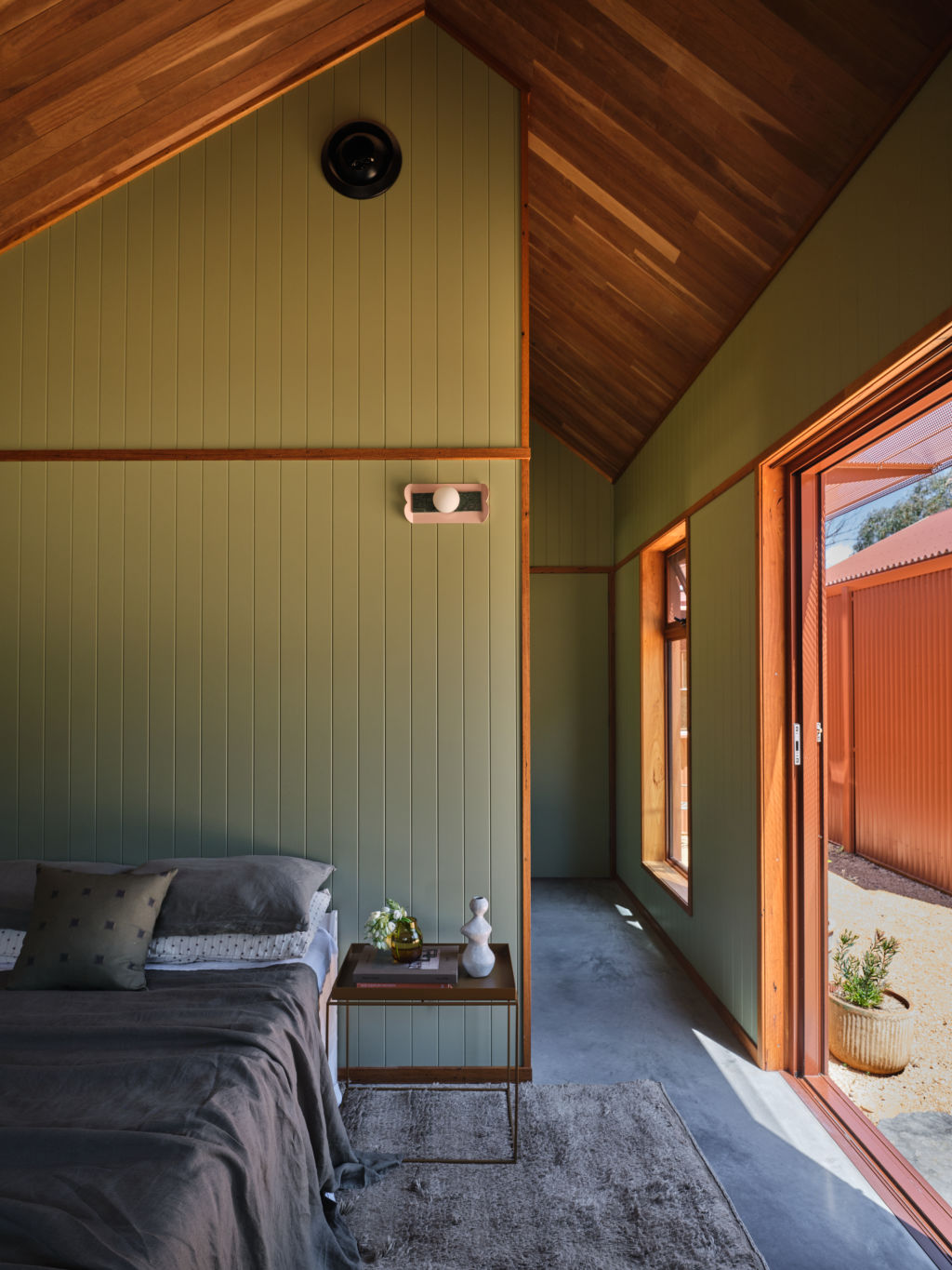 Inside, the house continues its quiet conversation with the land. Grey ironbark timber, untreated and raw, wraps the ceilings and walls, evoking local shearing sheds while offering a more refined domestic version.