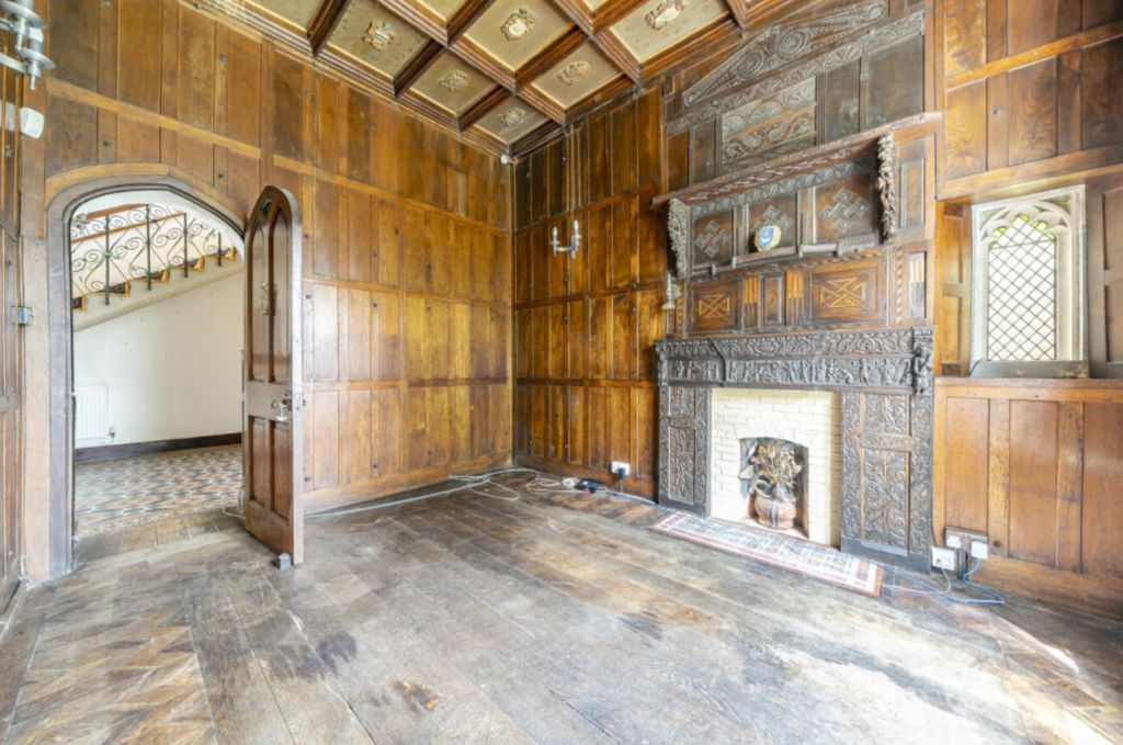 The home is filled with wooden panelling, carved fireplaces, chandeliers and candle sconces, giving it a dark, theatrical look.